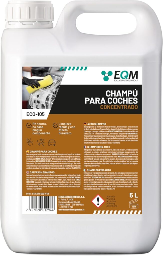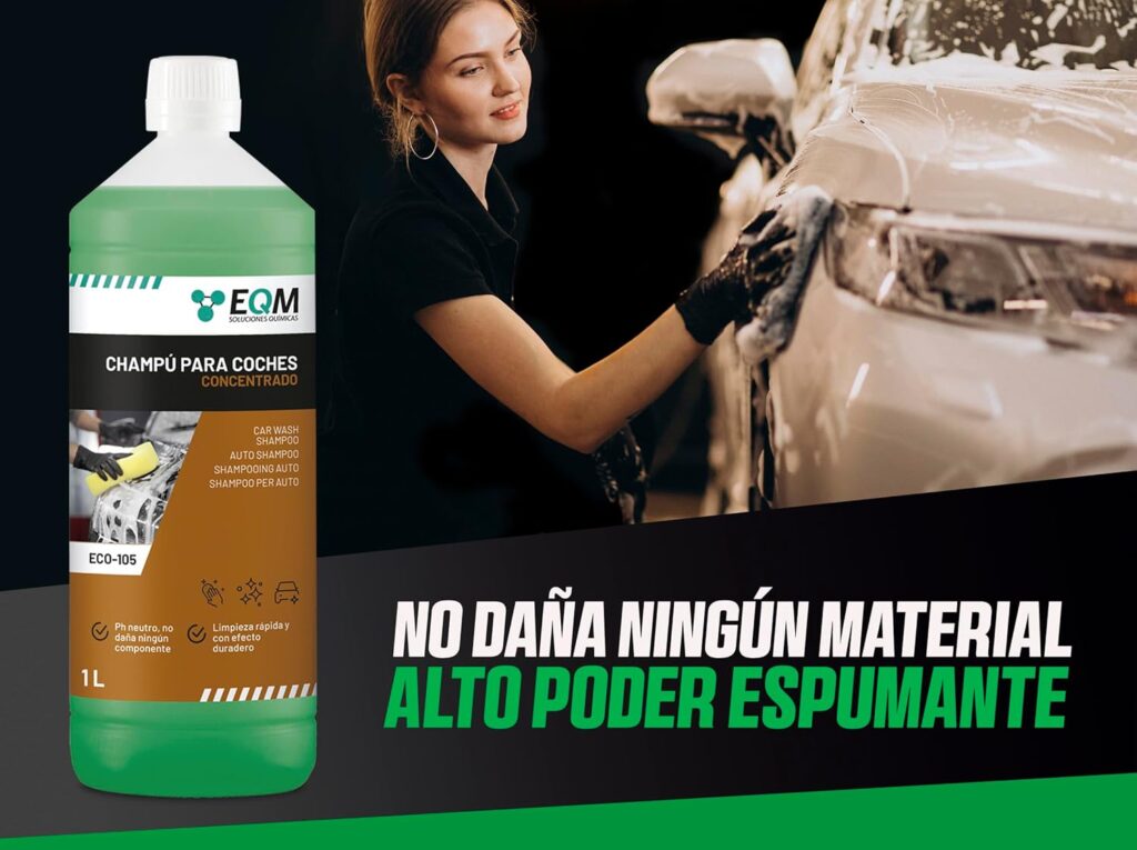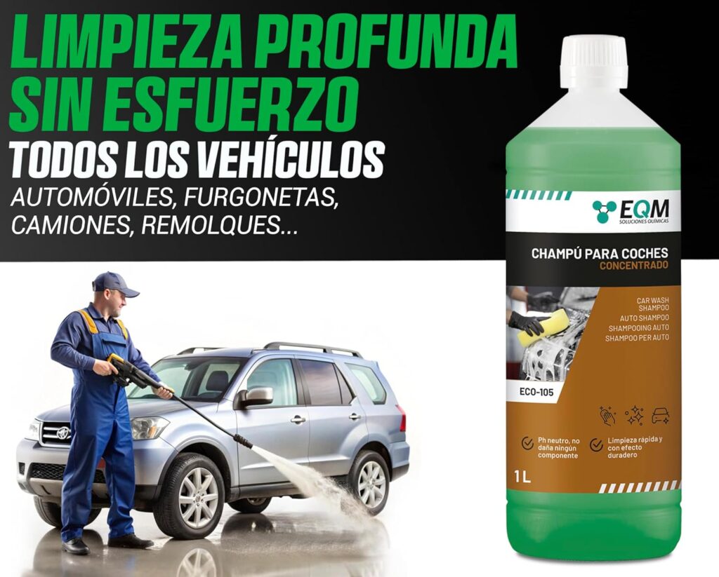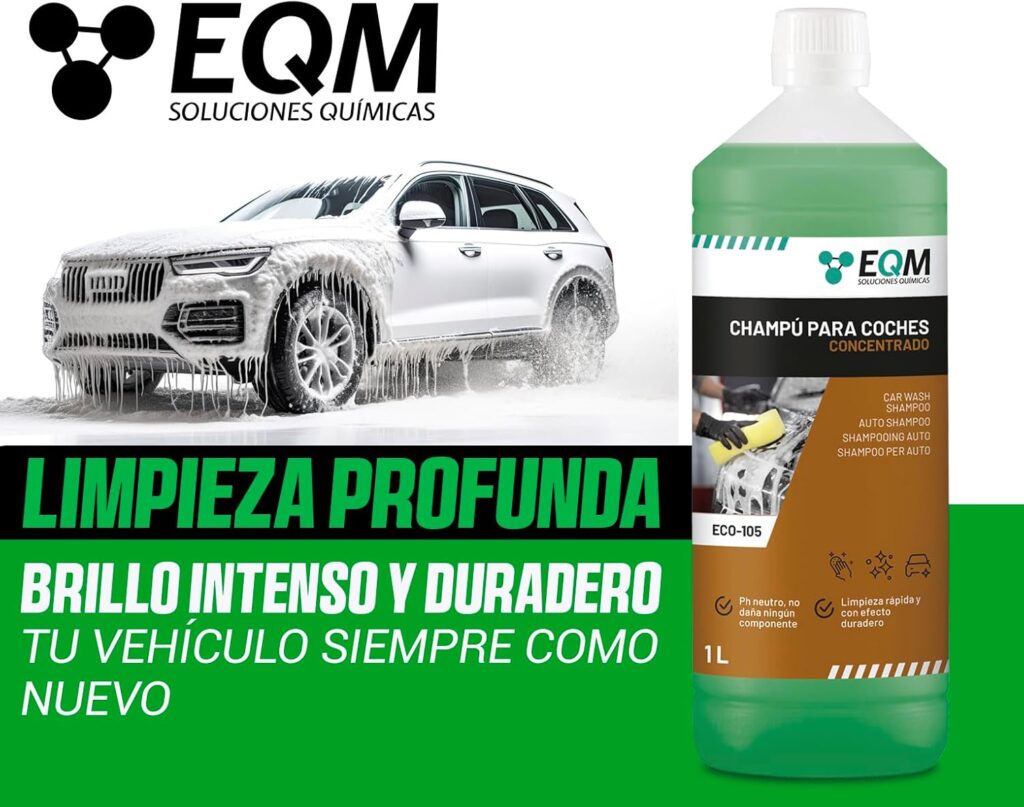 El Champú Concentrado EQM 1L es un producto para el lavado exterior del coche que se utiliza diluido en agua y aplicado de forma manual. Su formato concentrado permite ajustar la cantidad utilizada en cada lavado, algo habitual en este tipo de champús para mantenimiento regular del vehículo.