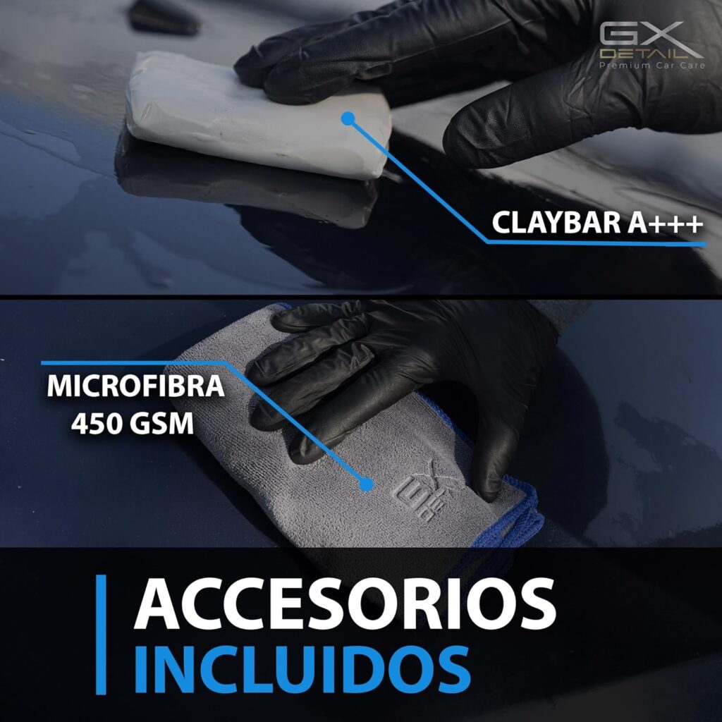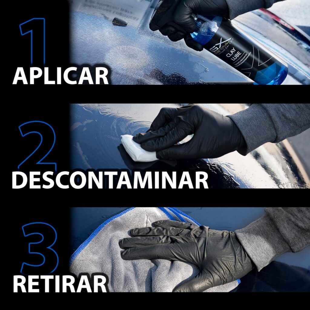 El GxDetail Clay Lube 500 ml es un lubricante para carrocería utilizado durante el proceso de descontaminación con clay bar. Su función principal es reducir la fricción entre la barra de arcilla y la superficie del coche, facilitando la eliminación de contaminantes adheridos a la pintura.